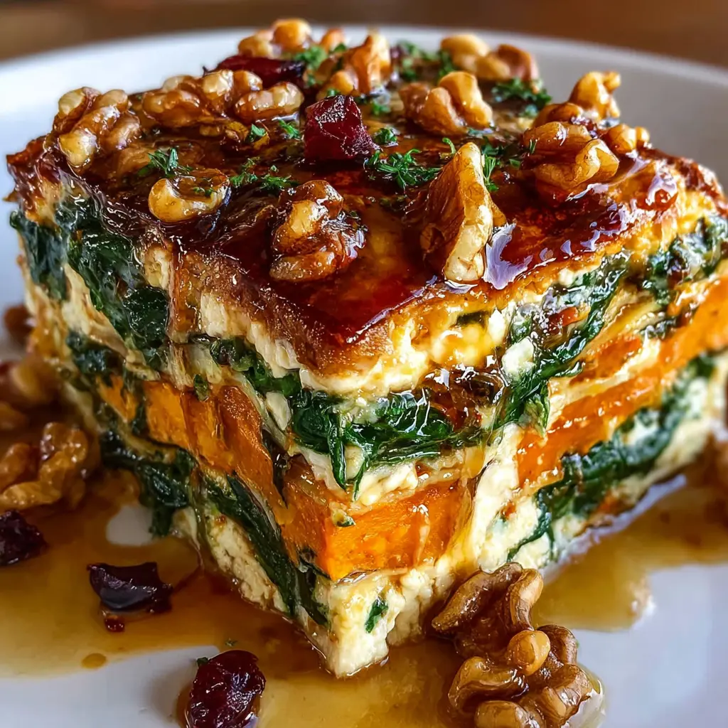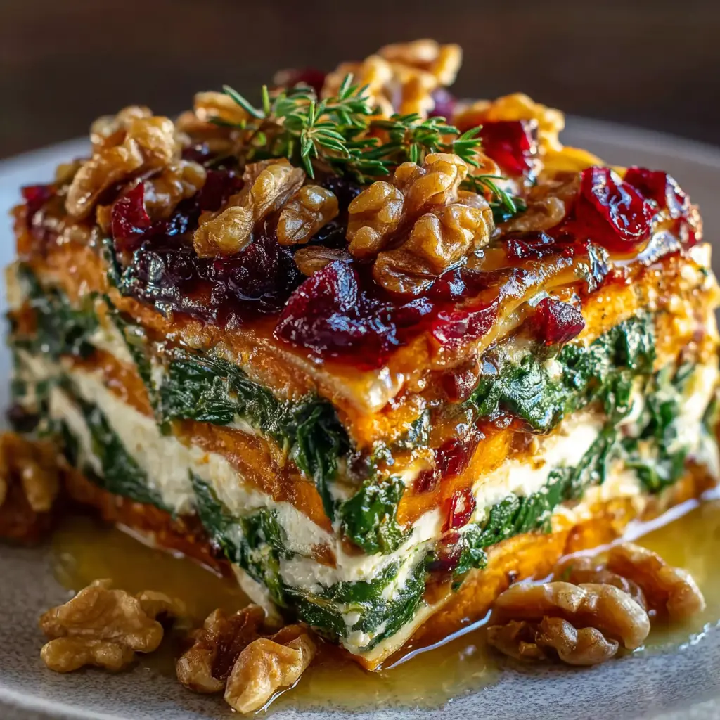 Layered Sweet Potato, Spinach & Ricotta Lasagna: Indulge with Walnuts & Cranberry Honey Sauce